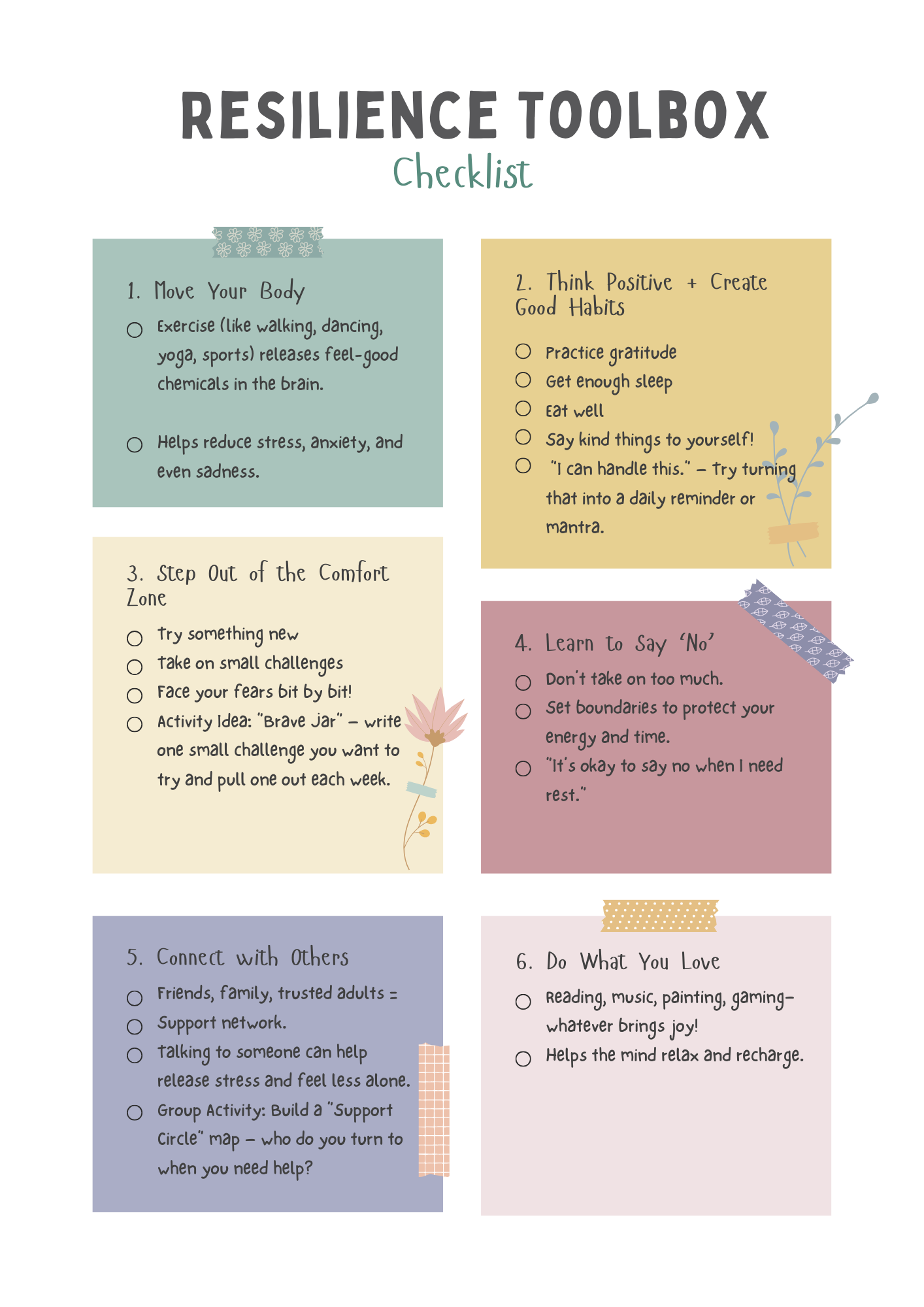 Let’s break it down into simple tools that young people can use. You can show this like a “Resilience Toolbox: