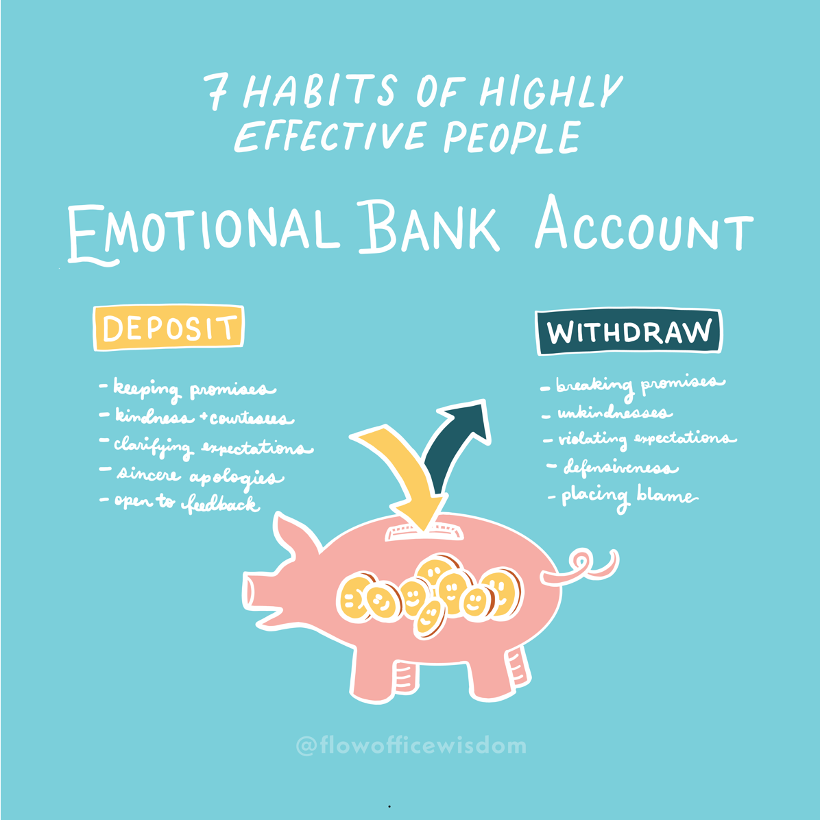 Withdrawing from the emotional bank account is natural. Examples are being bossy, assuming that you understand, breaking commitments, rejecting feedback.