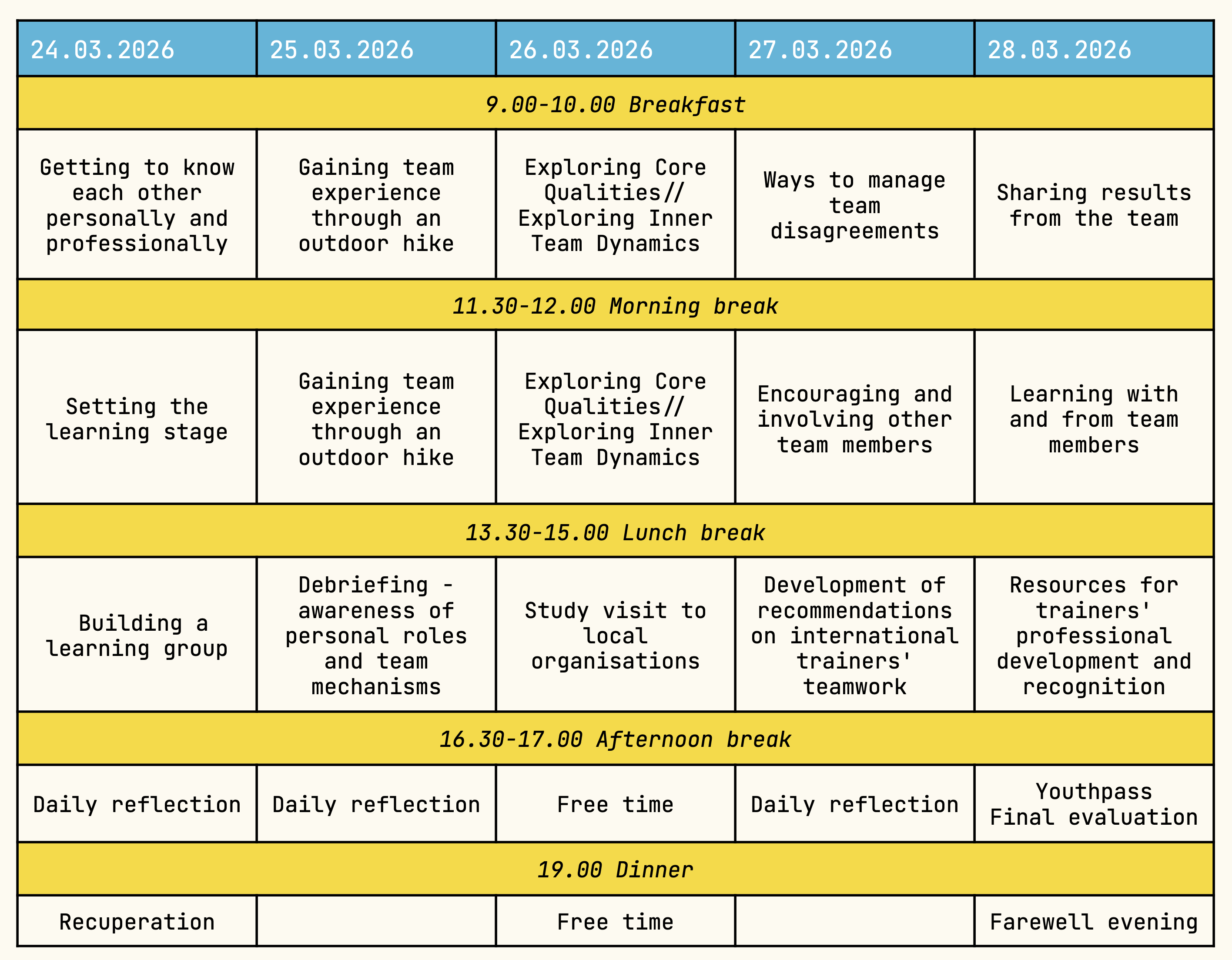 The training course will contribute to the development of trainers’ competencies in the area of “Cooperating successfully in teams”: